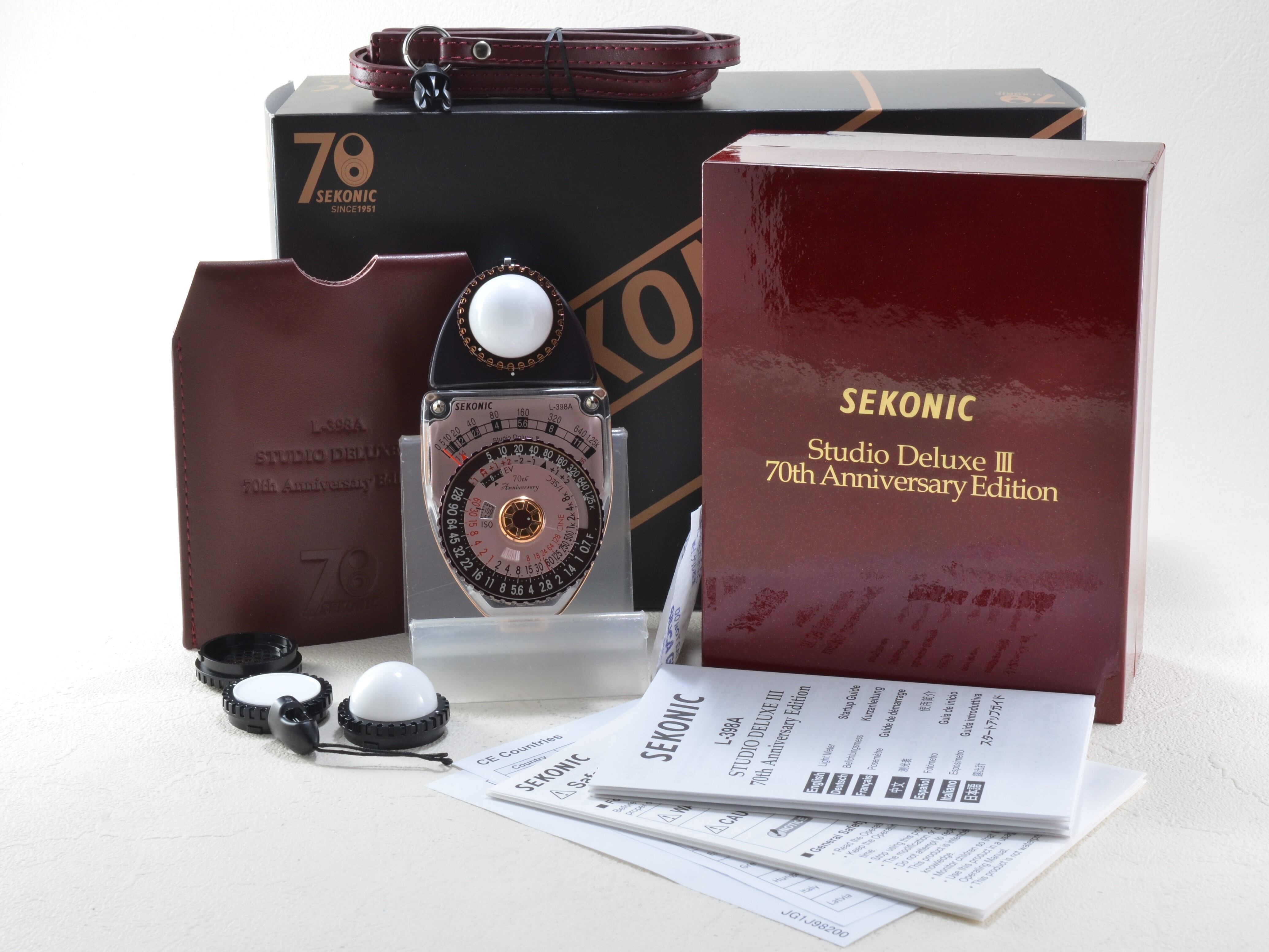2021年の夏に70台限定で発売されたかなりの希少性がある露出計です。ヴァーガンディーカラーのボディにローズゴールドの限定カラーリングで、 タイム銘板に[70th Anniversary] 記念ロゴが入っています。 漆紙を使用した化粧箱に入っており、特性レザーストラップ&レザーケースが付属されています。